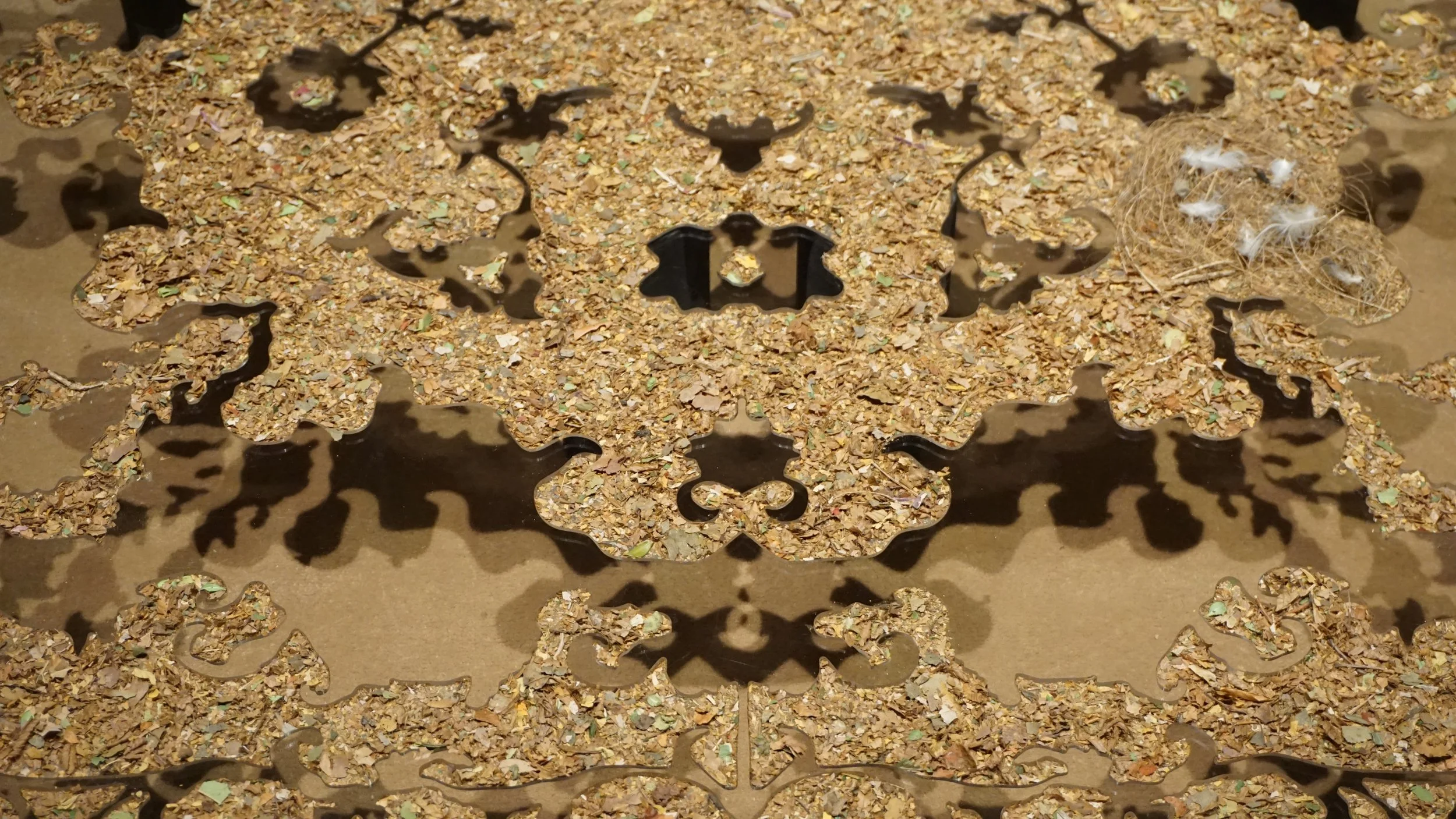 This once was Addie’s bedroom. A cozy and intimate space where to recollect and rest. Central to this room was a large Persian rug that faced the fireplace—its rich patterning and color pallet added a touch of domestic warmth to the grand aura of the marble palace. Persian rugs are deeply intertwined with the cultural and religious heritage of Iran. They often feature motifs and patterns that are symbolic, such as solar symbols or the Tree of Life, which represent immortality and eternal life. In this piece, Motlagh explores entwined histories of migration and cultural identity and how a rug can connect faraway lands, identities, and realities. This sculptural piece, which reproduces the patterns of one of the rugs in the artist’s native Iranian home comprises dried leaves collected from trees her father planted in the family garden mixed with others that were collected during the autumn of 2024 around the Nickerson’s Mansion. Blend together, these vegetal fragments map a rich and harmonious pattern of timeless memories and ideals.